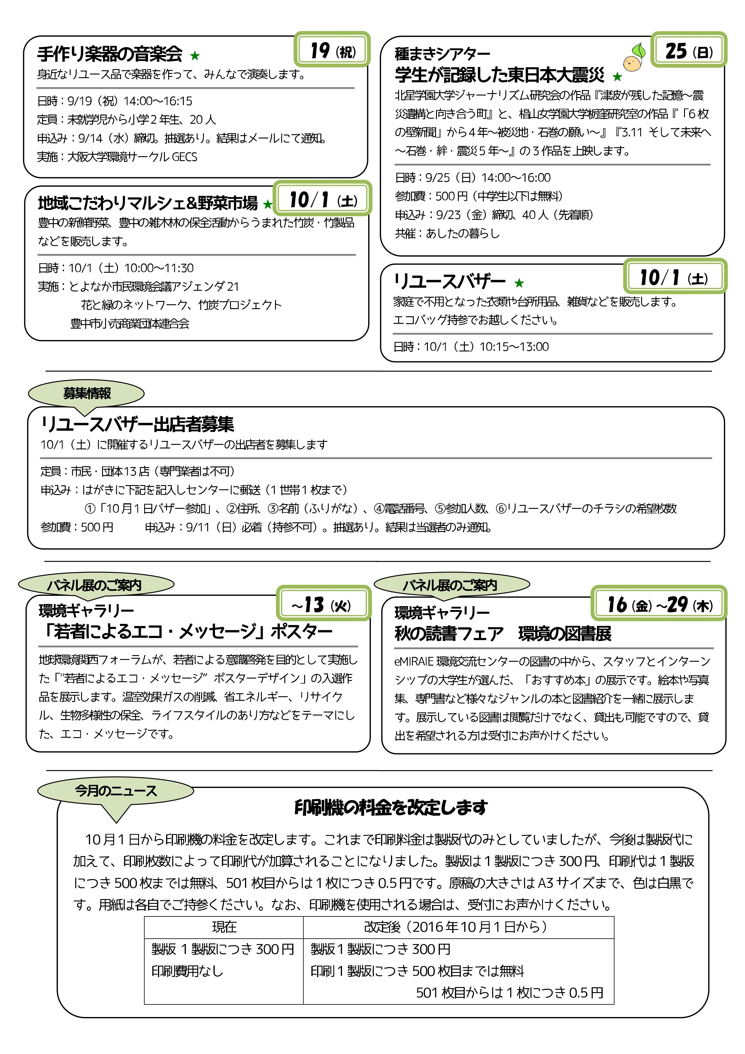 2016年10月1日(土)地域こだわりマルシェ&野菜市場を開催いたします 最近不安定なお天気が続きますね。運動会などの行事も多い時期ですので、すっきり晴れて欲しいと思う今日この頃です。 10月の地域こだわりマルシェ&野菜市場は1日(土)開催です。 季節のお野菜や美味しいものを取り揃えて皆さまをお待ちしております! そして今回は10:15から「リユースバザー」も開催されます。掘り出し物や欲しかったあの商品がお得に手に入るかも?! なお、お越しの際はエコバッグなどお買い物袋のご持参をおすすめいたします。 是非お立ち寄りくださいね!お待ちしております(^-^)/ 投稿ナビゲーション 2016年9月24日(土)・25日(日)おかまちレールロード開催いたします2016年9月24日・25日「おかまちレールロード」の様子です コメントを残すコメントをキャンセル
