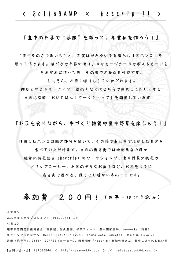 2016年12月17日(土)のイベント「おいもはん」 12月。そろそろ年賀状の準備を始められた方も多いのではないでしょうか。 昨今はパソコンで年賀状という方が多いですが、今年こそは手作り年賀状を…と考えられている方におすすめのイベントがありますよ! 12月17日(土)服部阪急商店街で開催される「おいもはん」、豊中のお芋で“芋版”を彫って、年賀状を作ろう!がメインのイベントです。 “豊中産のさつまいも”と、年賀はがきや切手を購入し「芋ハンコ」を彫って頂きます。はがきや季節の便り、メッセージカードやポストカードをそれぞれに作った後、その場での投函も可能です。 もちろん、お持ち帰りもしていただけます。 彫刻刀やカッターナイフ、絵の具などはこちらで用意しておりますし、当日は常時「おいもはん!ワークショップ」を開催しています! そして、お芋を食べながら、手づくり雑貨や豊中野菜を楽しもう!ということで、使用したハンコは版の部分を除いて、その場で蒸し器でふかしたものを食べていただけます。 当日の商店街では地域商店のほか雑貨の販売出店(Hattrip)やワークショップ、豊中野菜の販売やドリップコーヒー、お芋のデリやお菓子など、お芋を片手に商店街で遊べる、ほっこり暖かい冬の一日です。 時間は10時~16時まで。芋版で年賀状を作って、美味しいお芋を食べて楽しんでみませんか? 詳しくはこちら http://peacock64.com/and-hattori/post-2161/ 投稿ナビゲーション 2016年12月11日(日)庄内神社・青空市を開催いたします2016年12月18日(日)おいなりさんの第3日曜朝市を開催いたします! コメントを残すコメントをキャンセル