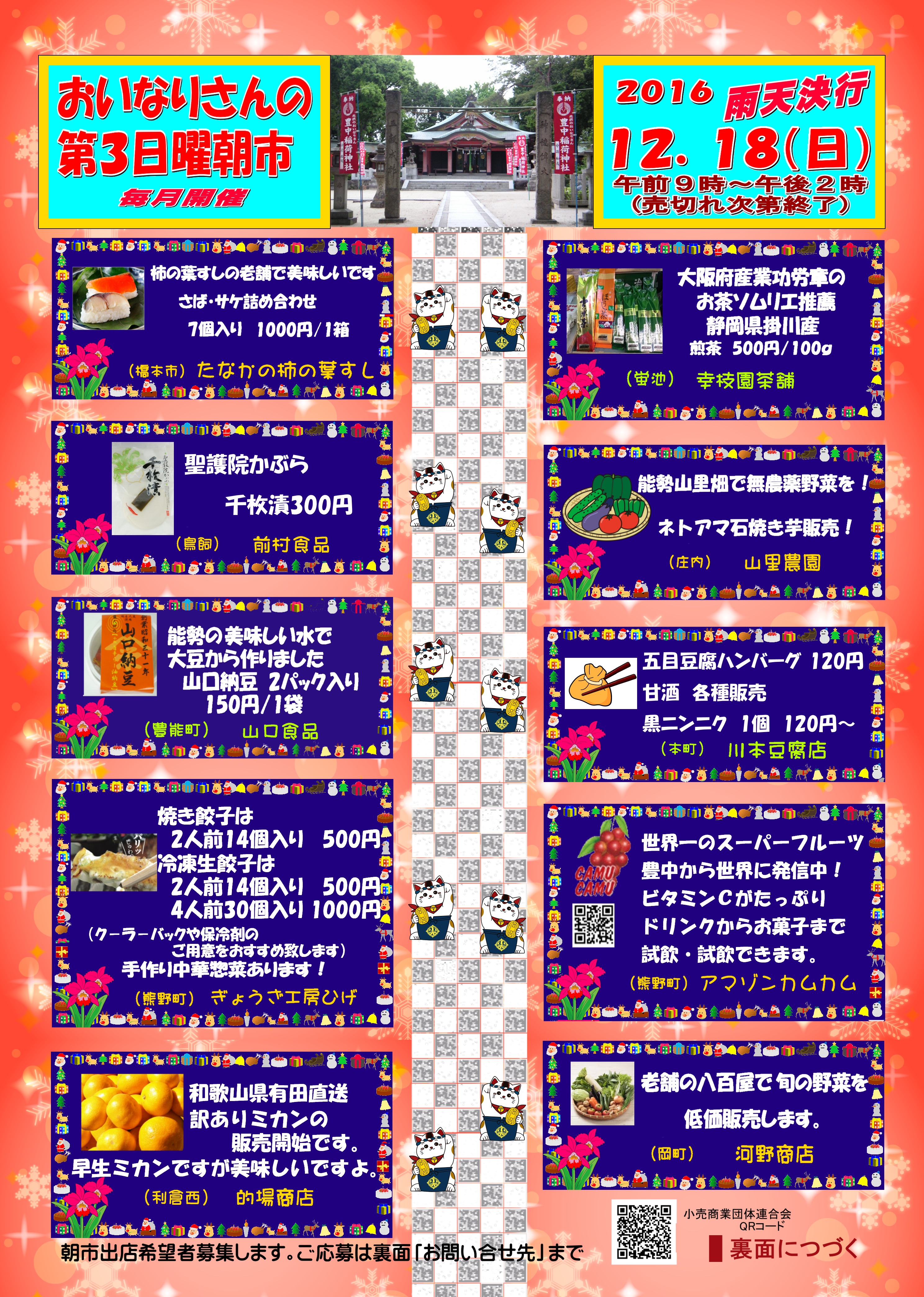 2016年12月18日(日)おいなりさんの第3日曜朝市を開催いたします! 2016年も残りあとわずかとなりました。今年最後の朝市は12月18日(日)に開催いたします。 前回好評だった揚げたてカレーパン、初登場のガラス雑貨のお店さんが出店される予定です。また、シュトーレンなどのクリスマスのお菓子も並びますよ。 恒例のjazzライブも、クリスマスにちなんだ音楽が登場するかも⁉ 皆様是非お立ち寄りくださいね!お待ちしております! 投稿ナビゲーション 2016年12月17日(土)のイベント「おいもはん」マチカネくんのもなかとマチカネくんブッセが紹介されています! コメントを残すコメントをキャンセル
