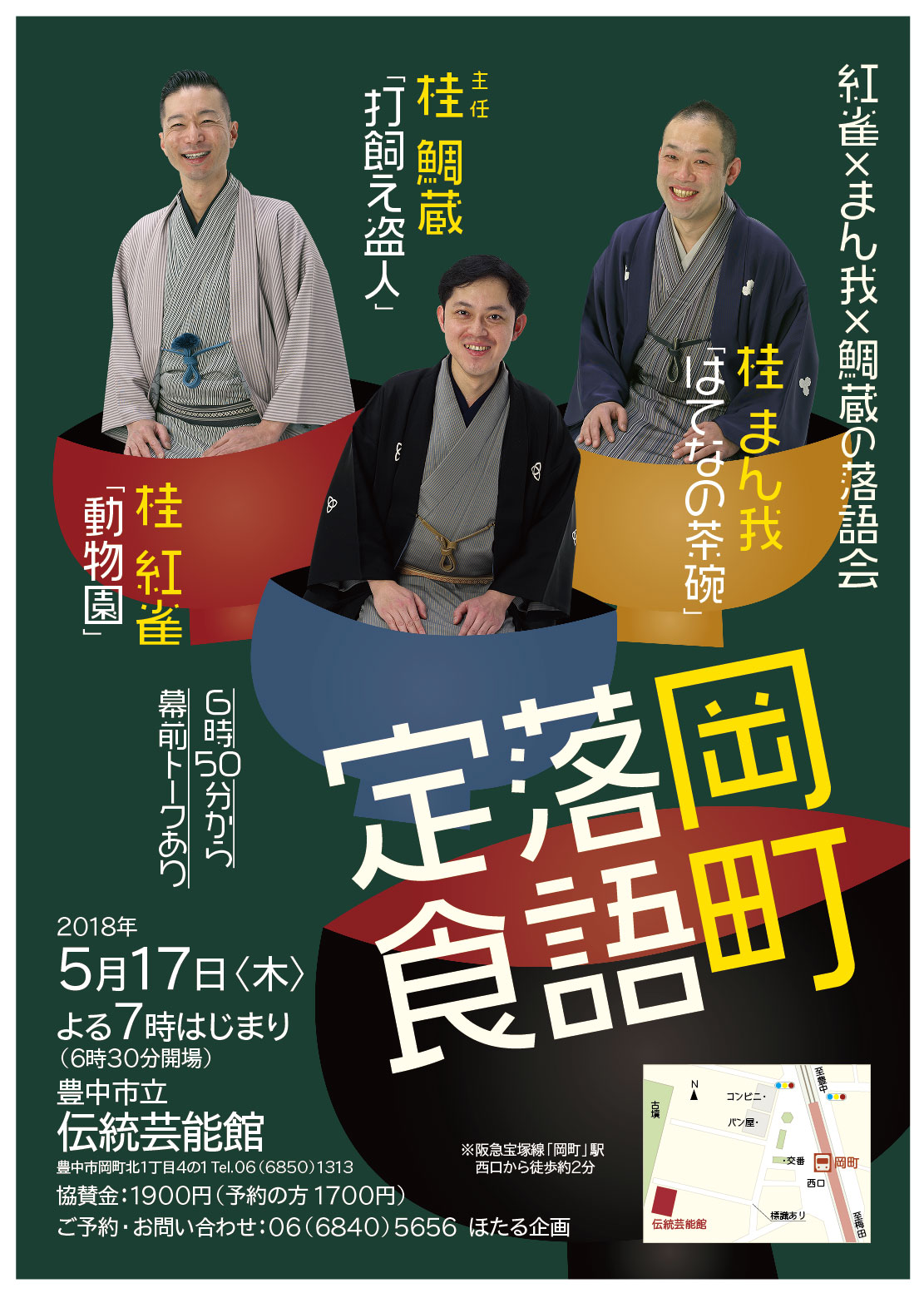 2018年5月17日(木)のイベント「岡町落語定食」 岡町にある豊中市立伝統芸能館で、落語会が開催されます。 【岡町落語定食】 日時:5月17日(木)19時開演(18時30分開場 20時30分頃終演予定) 会場:豊中市立伝統芸能館 阪急宝塚線「岡町」から西へ約200m) 桂鯛蔵「打飼盗人」 桂まん我「はてなの茶碗」 桂紅雀「動物園」 ※18:50から幕前トークあり 協賛金:1,900円(予約の方は1,700円) 予約・お問い合わせ:ほたる企画 06-6840-5656 確実にご覧になりたい方にはご予約をおすすめします! 皆さまお誘いあわせの上、是非お越しくださいね! 投稿ナビゲーション 2018年5月5日(土)地域こだわりマルシェ&野菜市場を開催いたします2018年5月20日(日)おいなりさんの第3日曜朝市を開催いたします。 コメントを残すコメントをキャンセル