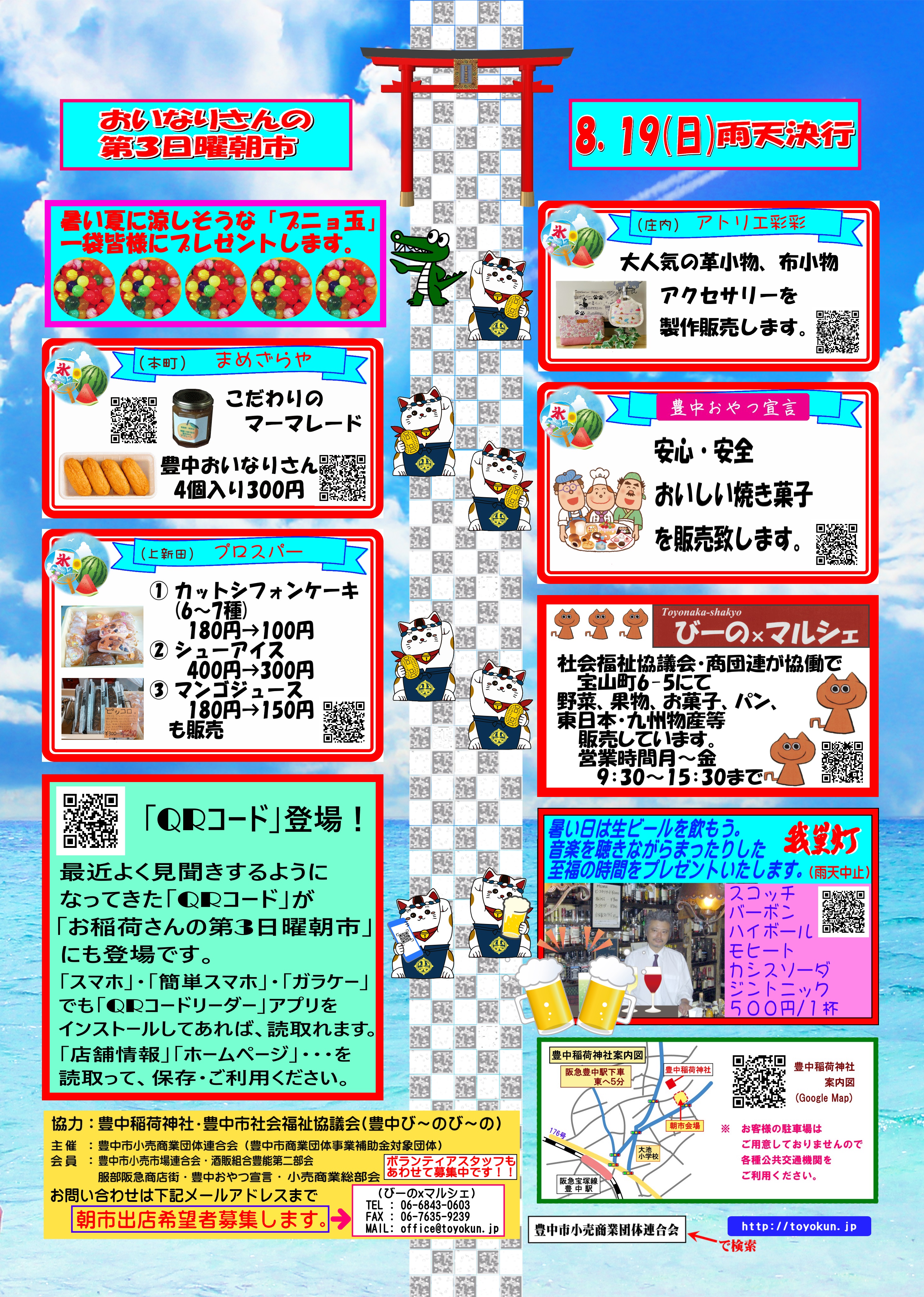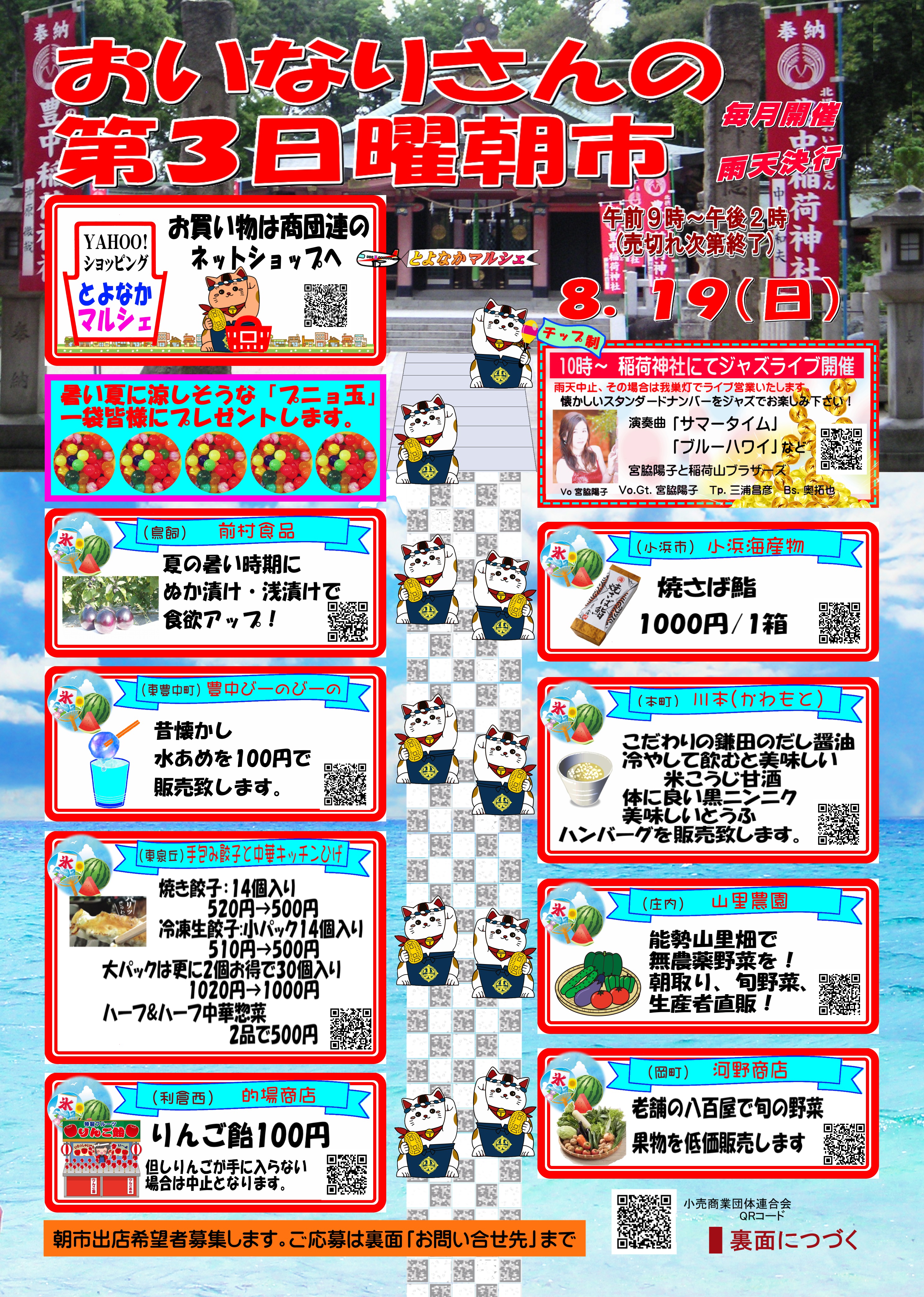 2018年8月19日(日)おいなりさんの第3日曜朝市を開催いたします。 今、第100回夏の全国高校野球大会が開催されていますね。 100回目の記念大会ということで、第1回大会が行われた豊中でも関連イベントがたくさんあります。普段は野球になじみがない方も、この機会にイベントに足を運んでみられるのも良いかも知れませんよ。 熱戦が繰り広げられている真っ只中の8月19日(日)に「おいなりさんの第3日曜朝市」を開催いたします。 新鮮な野菜や果物、焼きたての餃子や作り立てのいなり寿司、お漬物などを販売いたします。 暑いこの季節には、冷たいビールが合いますね。ジャズを聴きながら午前中からビールを一杯というのもおすすめです^^; まだまだ猛暑が続きますので、熱中症対策・日焼け対策をしっかりして是非お立ち寄りくださいね! 投稿ナビゲーション 2018年8月15日(水)のイベント「第二回 岡町落語定食」新製品レモンケーキ コメントを残すコメントをキャンセル