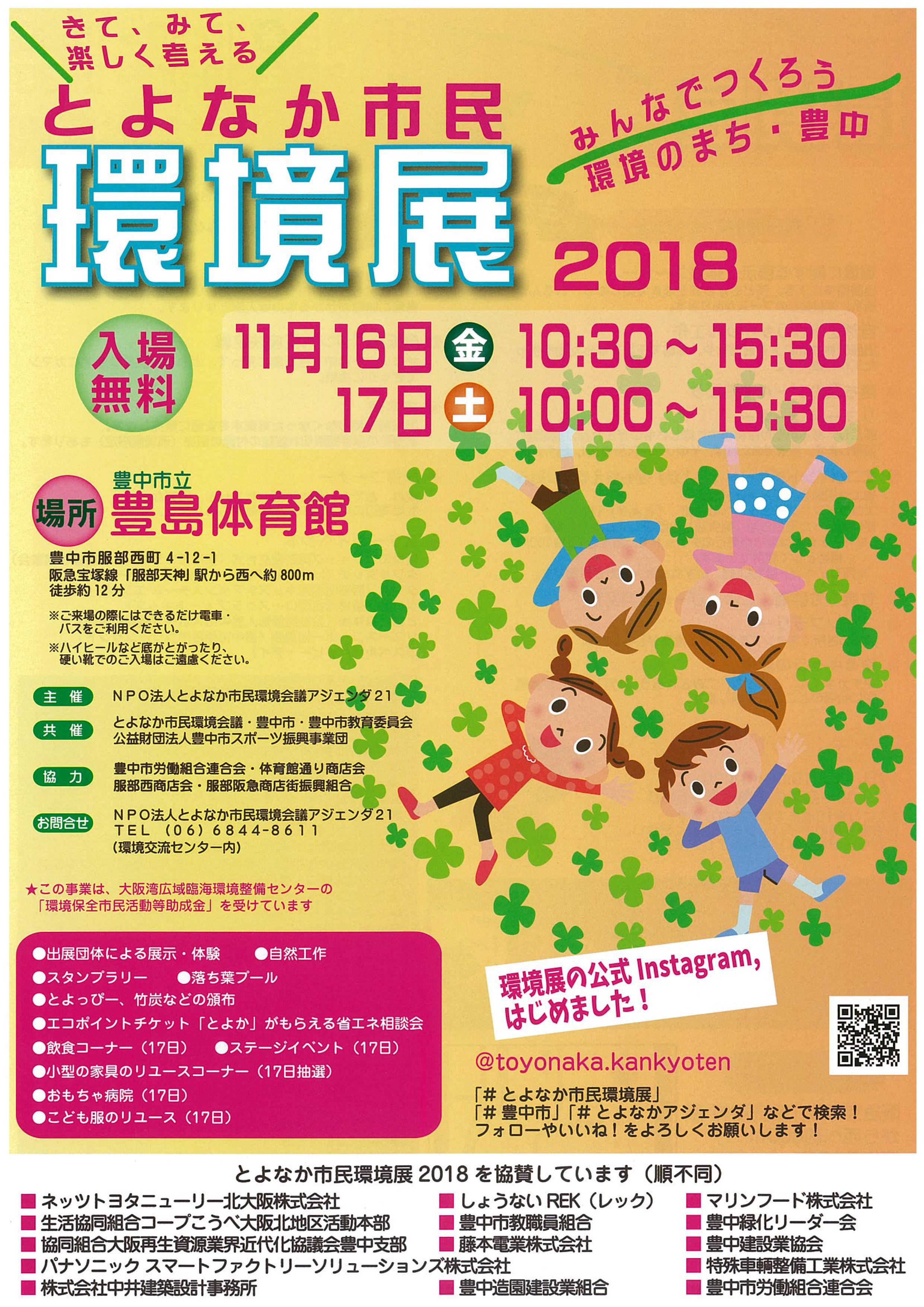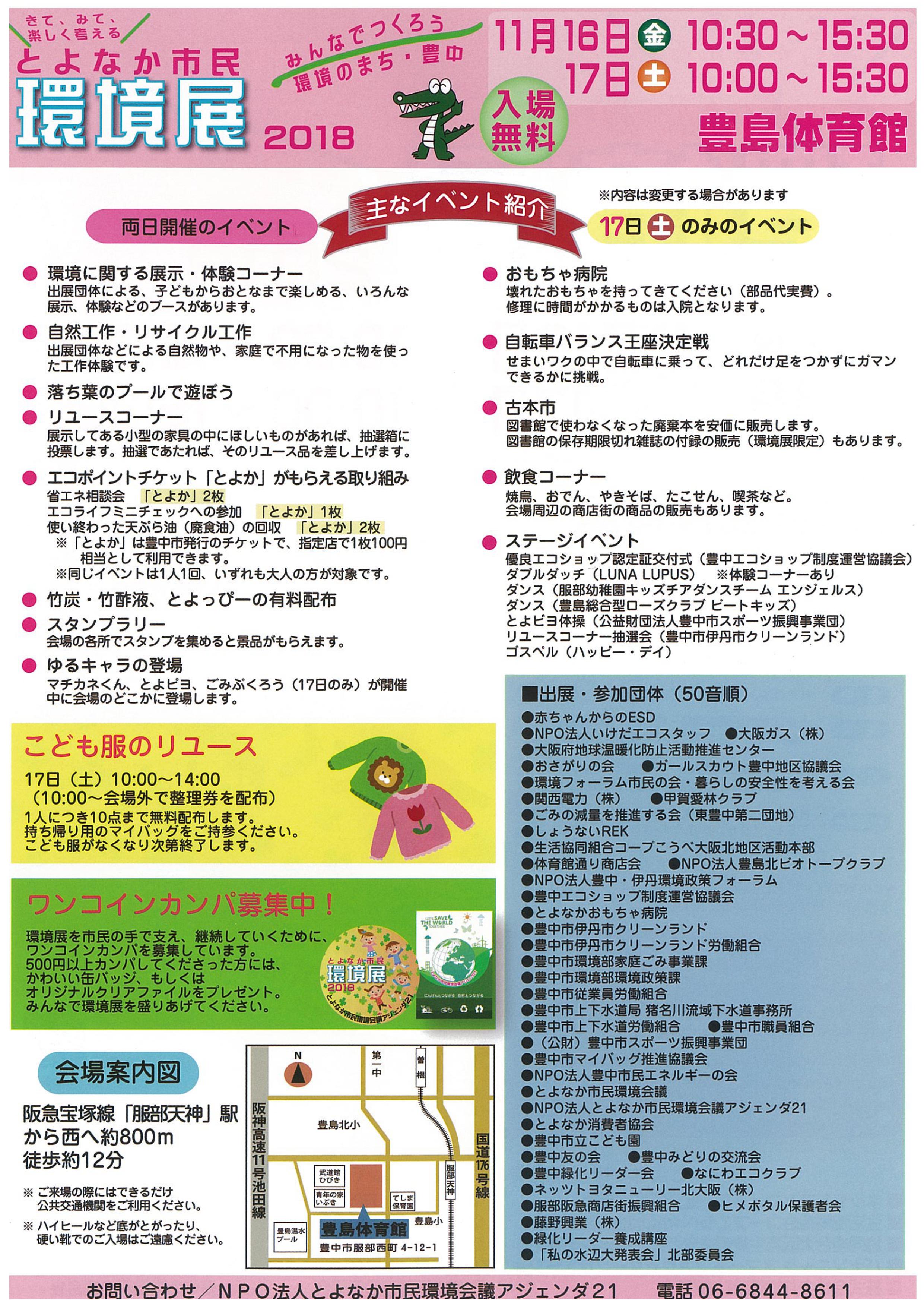 2018年11月16日(金)・17日(土)のイベント「とよなか市民環境展2018」 豊中市立豊島体育館(阪急宝塚線「服部天神駅」から西へ約800m 徒歩約12分)にて毎年恒例の「とよなか市民環境展」が開催されます。 日時は11月16日(金)は午前10時30分から午後3時30分まで、11月17日(土)は午前10時00分から午後3時30分までとなっております。 16日・17日を通して開催されるイベントは、環境に関する体験・展示コーナーや竹炭・竹炭液・とよっぴーの有料配布にスタンプラリー、「とよか」がもらえる省エネ相談会やエコライフミニチェック、使い終わった天ぷら油の回収などがあります。 17日には、ステージや模擬店、古本市や子供服のリユースなどがあります。子供服のリユースは10時より会場外で整理券を配布しますのでご注意ください。 持ち帰り用のマイバッグをご持参くださいね。 ご来場の際には、できるだけ公共交通機関をご利用お願いします。 ハイヒールなど、底がとがったり、硬い靴でのご入場はご遠慮ください。 詳しくはチラシ、豊中市のホームページをご覧下さい。 www.city.toyonaka.osaka.jp/machi/kankyoseisaku/tikyu_mati/tikyu_mati_topics/kankyoten2018.html 投稿ナビゲーション 2018年11月17日(土)のイベント「第39回 豊中市農業祭」2018年11月25日(日)庄内神社・青空市を開催いたします コメントを残すコメントをキャンセル