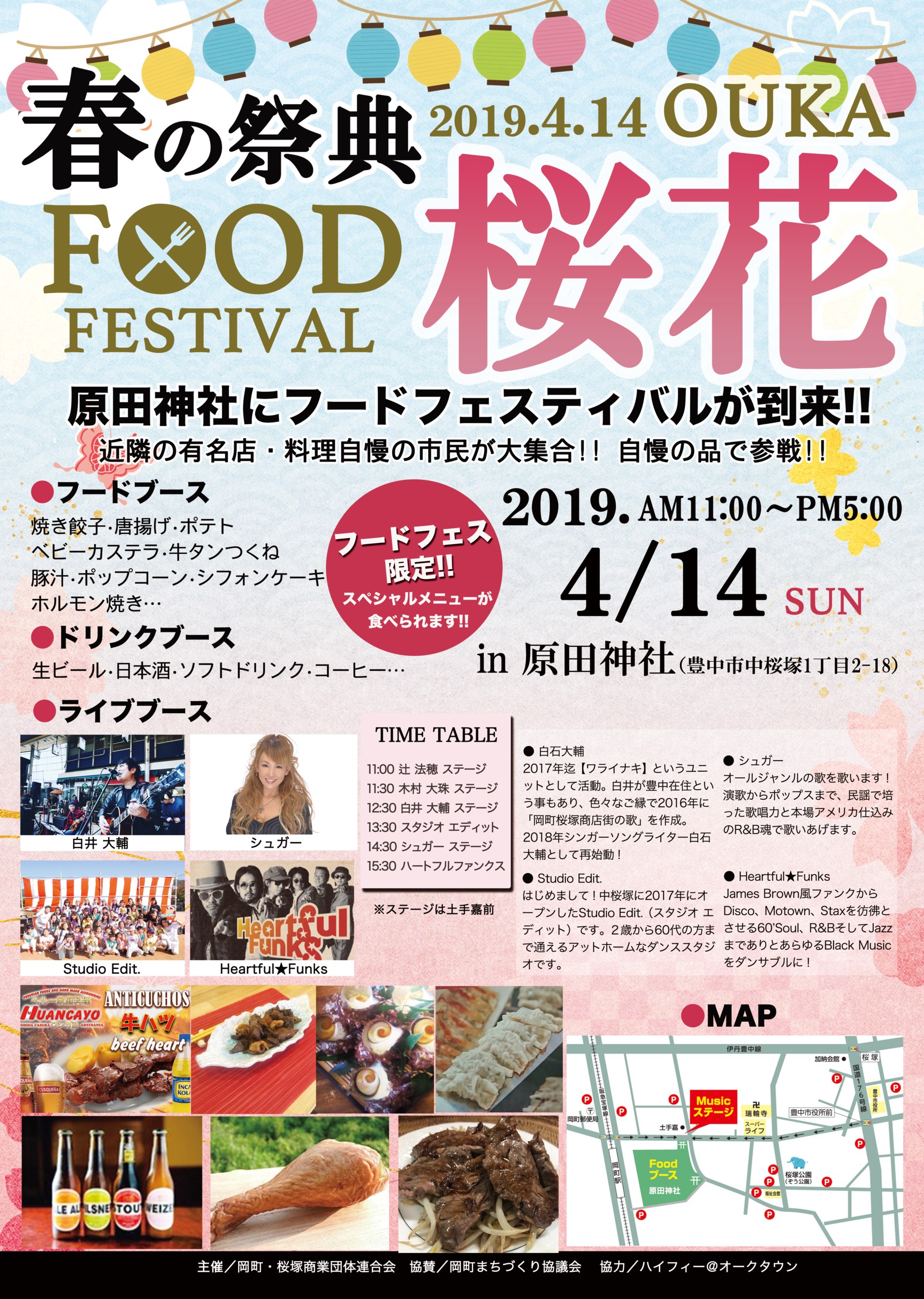 2019年4月14日(日)のイベント「春の祭典 フードフェスティバル桜花 2019」 今年も原田神社(阪急宝塚線「岡町」駅徒歩約2分)にて「フードフェスティバル桜花」が開催されます! 開催時間は11時から17時まで。近隣の有名店・料理自慢の市民の皆さまのお店が大集合!自慢の品・限定メニューが味わえます。 商団連からも、手包み餃子と中華キッチンひげさん、プロスパーさんなどが参加予定です。 岡町商店街の土手嘉前ではライブも開催されます。こちらもお見逃しなく。 お出かけにぴったりなこの時期、是非お立ち寄りくださいね! 投稿ナビゲーション 2019年4月6日(土)地域こだわりマルシェ&野菜市場を開催いたします豊中市ふるさと納税返礼品提供事業者の募集がスタートしています。 コメントを残すコメントをキャンセル