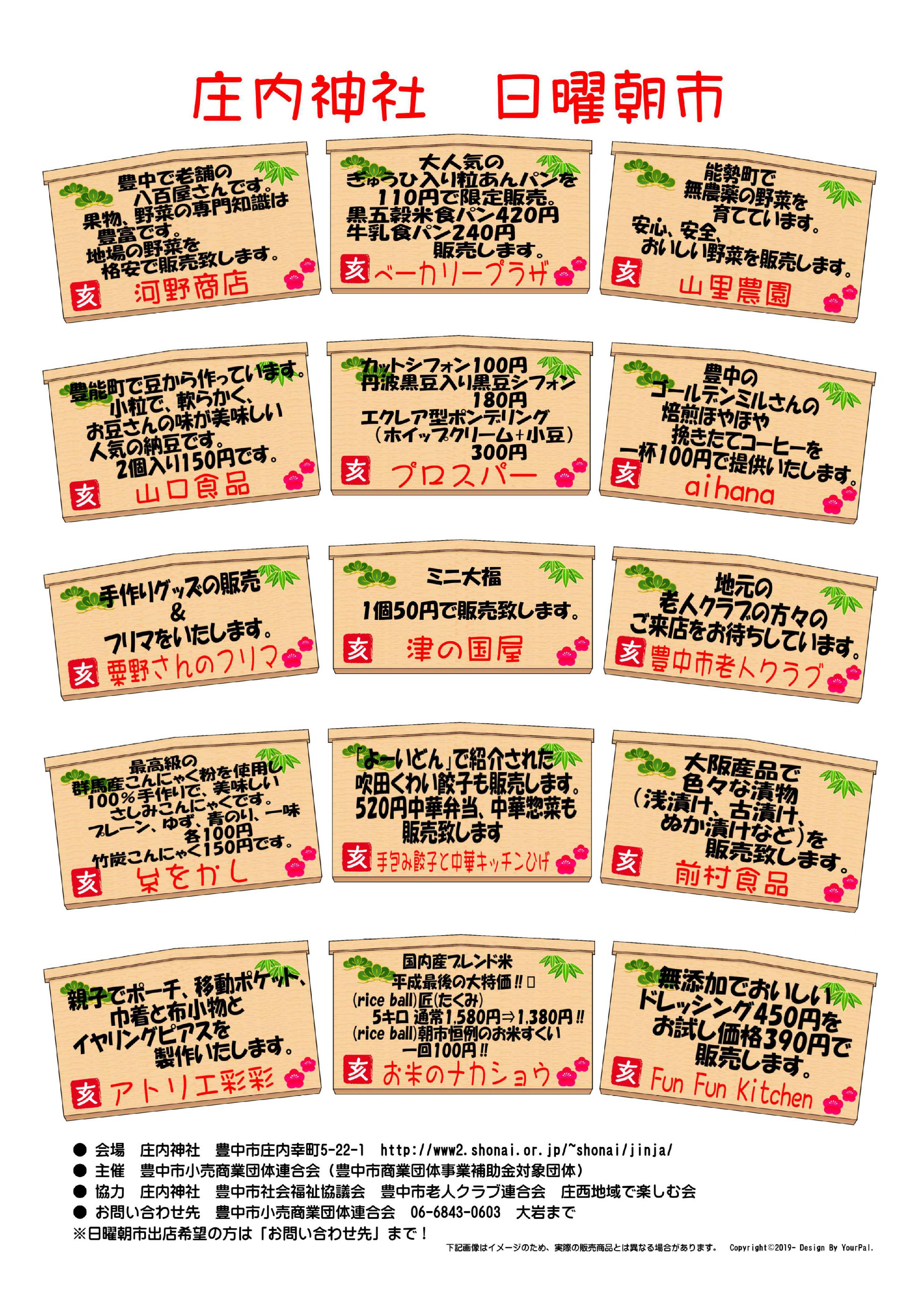 2019年4月28日(日)庄内神社日曜朝市を開催いたします もうすぐ「平成」が終わり「令和」がスタートします。 10連休中、お出かけの予定を入れていらっしゃる方もいらっしゃるでしょうか。 平成最後の開催となる「庄内神社・日曜朝市」は、まさに10連休中の4月28日(日)に開催いたします。開催時間は9時30分~13時まで。雨天決行です。 毎回大人気の季節の野菜や果物、お漬物やお惣菜、お菓子やパン、雑貨やフリマなどのお店が出店予定です。 皆さまお気軽にお立ち寄りくださいね! お待ちしております。 投稿ナビゲーション 2019年4月21日(日)おいなりさんの第3日曜朝市を開催いたします2019年5月4日(土)地域こだわりマルシェ&野菜市場を開催いたします コメントを残すコメントをキャンセル