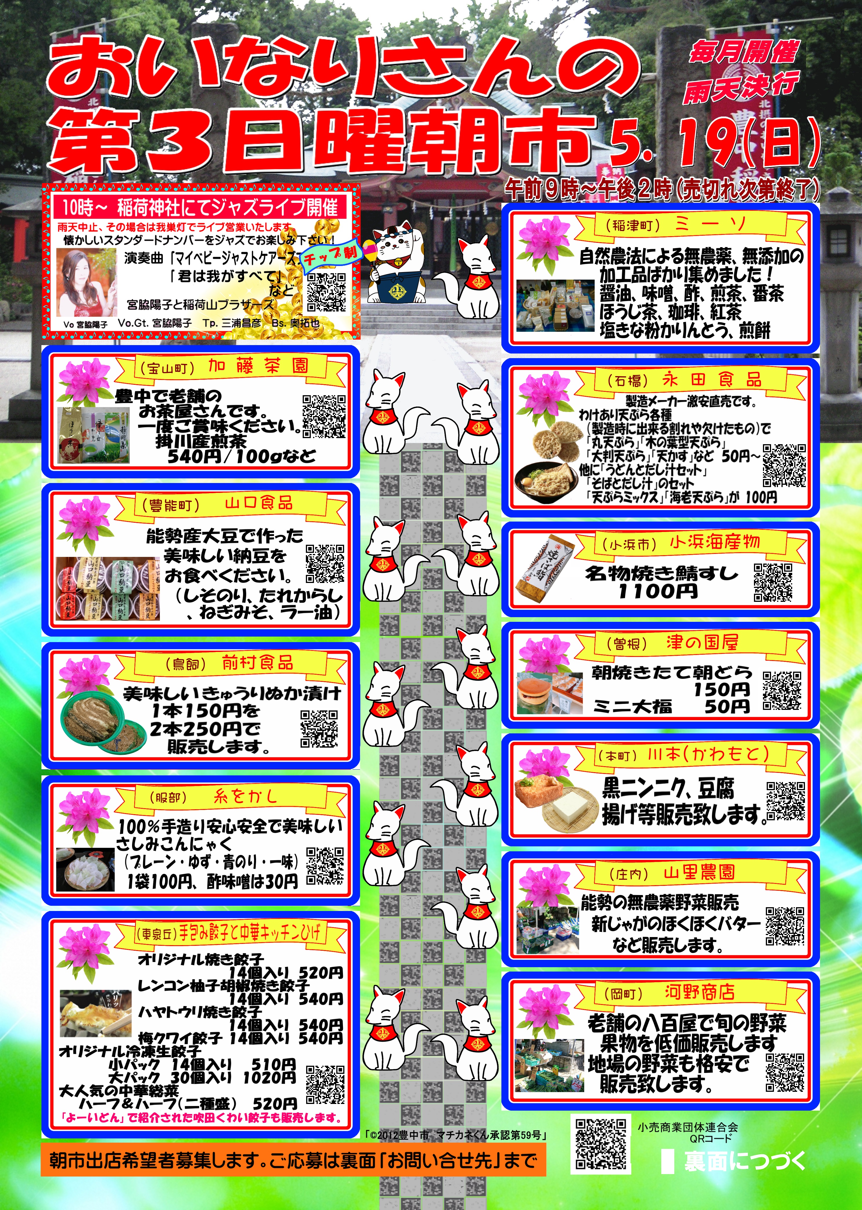2019年5月19日(日)おいなりさんの第3日曜朝市を開催いたします ご案内が遅くなって申し訳ございません! 「令和」最初の「おいなりさんの第3日曜朝市」を5月19日(日)に開催いたします。 時間は9時~14時まで。売り切れ次第終了となりますのでご了承ください。 今回も新鮮な野菜や果物、焼きたて餃子・中華惣菜、パンや和菓子、手作り雑貨、最近大人気のにんじんドレッシングなどを販売します。 皆様是非お立ち寄りくださいね! お待ちしておりますm(_ _)m 投稿ナビゲーション 2019年5月3日(金・祝)のイベント「ふれあい緑地フェスティバル2019」2019年5月26日(日)庄内神社・日曜朝市を開催いたします。 コメントを残すコメントをキャンセル