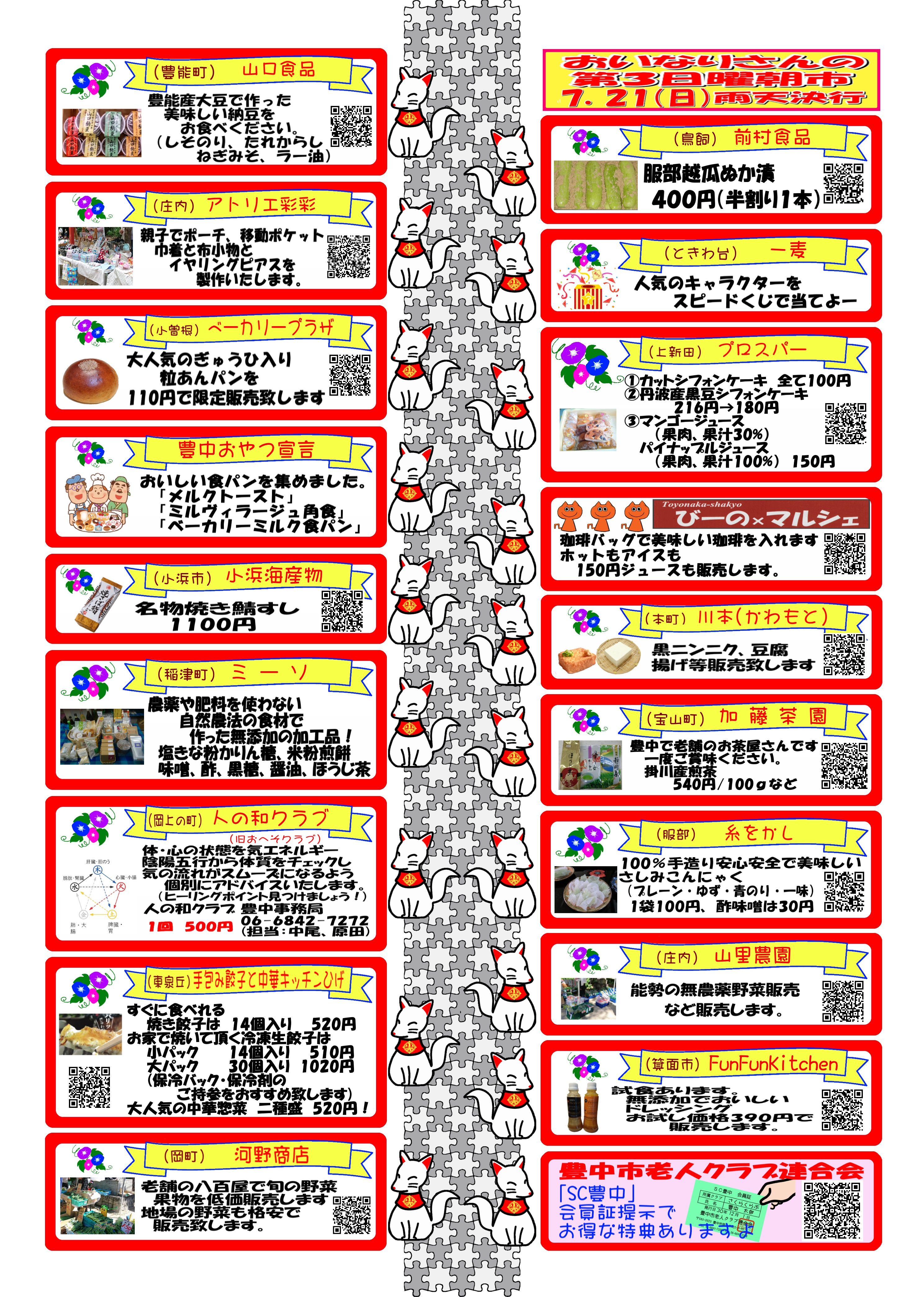 2019年7月21日(日)おいなりさんの第3日曜朝市を開催いたします すっきりしないお天気の日が続きますね。今年は梅雨入りが遅かった分、しばらくはこんなお天気が続きそうです。 7月の「おいなりさんの第3日曜朝市」は21日(日)9時~14時頃まで開催いたします。売切れ次第終了となりますのでご了承ください。 今回はポン菓子屋さんが初登場。材料にこだわった出来立てのポン菓子を販売いたします。また、箕面からタイ料理屋さんも出店されます。グリーンカレーやおつまみ、タイのビール等を販売予定です。この機会にお試しくださいね! 毎月大人気の季節の野菜や果物、焼き餃子やお漬物、パン・和洋菓子、手作り雑貨の販売もございます。 暑くなりそうなので、熱中症・日焼け対策をしてお越しくださいね! 皆さまのお越しをお待ちしております。 投稿ナビゲーション 2019年7月7日(日)のイベント「豊中駅前七夕まつり」2019年7月27日(土)・28日(日)のイベント「ちびっこ天国 おかまち夜店大会」 コメントを残すコメントをキャンセル