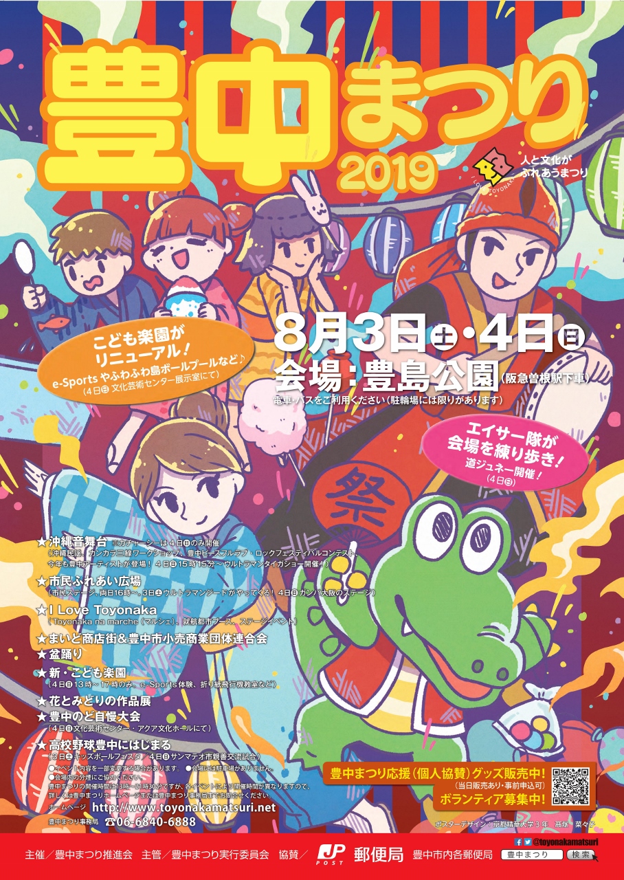 2019年8月3日(土)・4日(日)のイベント「豊中まつり2019」 豊中市で一番規模の大きいお祭り「豊中まつり」が今年も豊島公園で開催されます。 今年はステージの開始時間が少し遅くなるようです。 詳しくは、豊中まつり公式ホームページ、公式ガイドをご覧下さいね。 www.toyonakamatsuri.net/ 商団連も「まいど商店街・豊中市小売商業団体連合会」エリアで、ビールやジュース、焼き餃子やきゅうりの浅漬け、すくいものなどで出店します。 暑い中ですので、熱中症対策、日焼け対策をしっかりしてお越しくださいね! お待ちしております。 投稿ナビゲーション 2019年7月28日(日)庄内神社日曜朝市を開催いたします2019年8月18日(日)おいなりさんの第3日曜朝市を開催いたします コメントを残すコメントをキャンセル