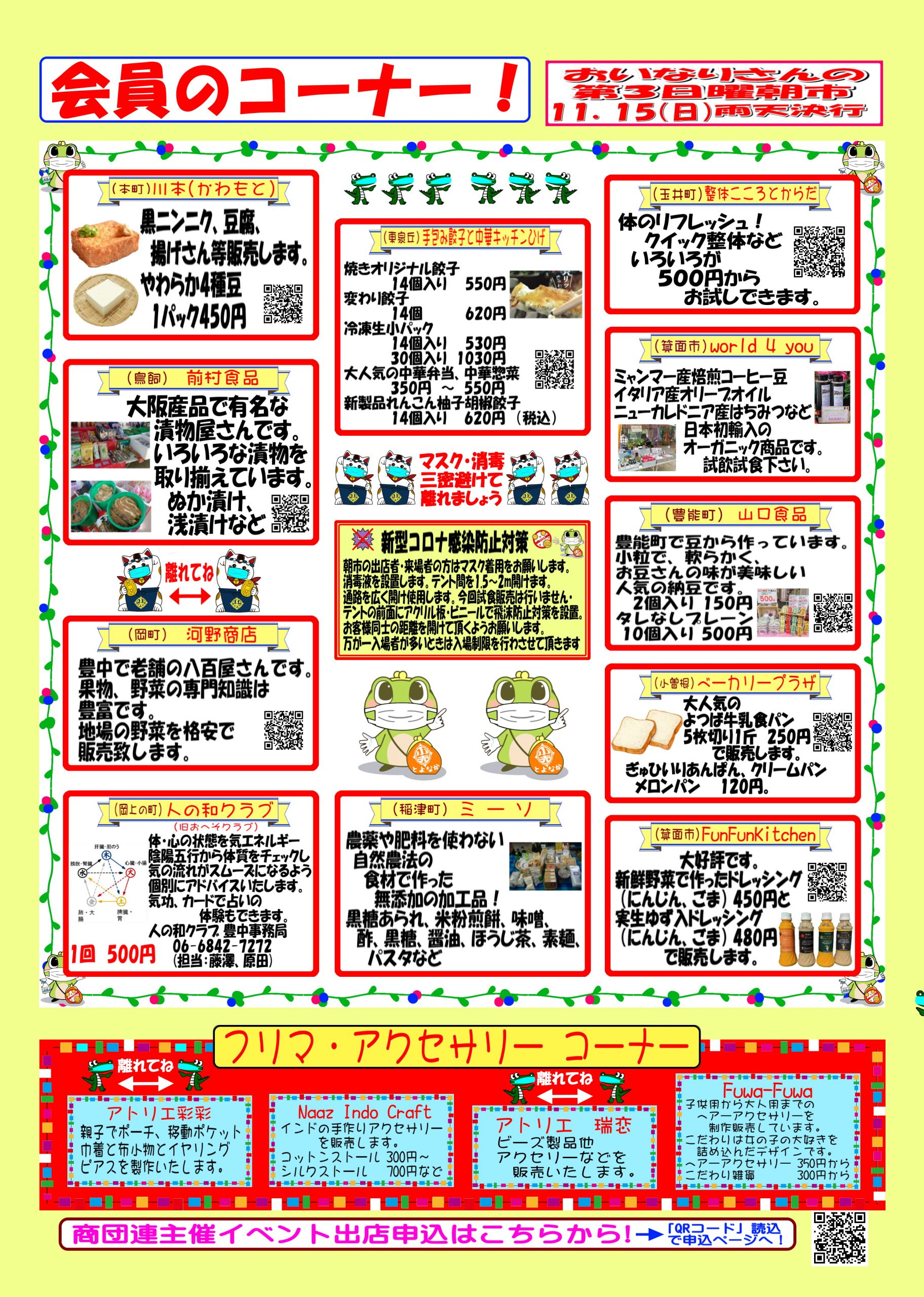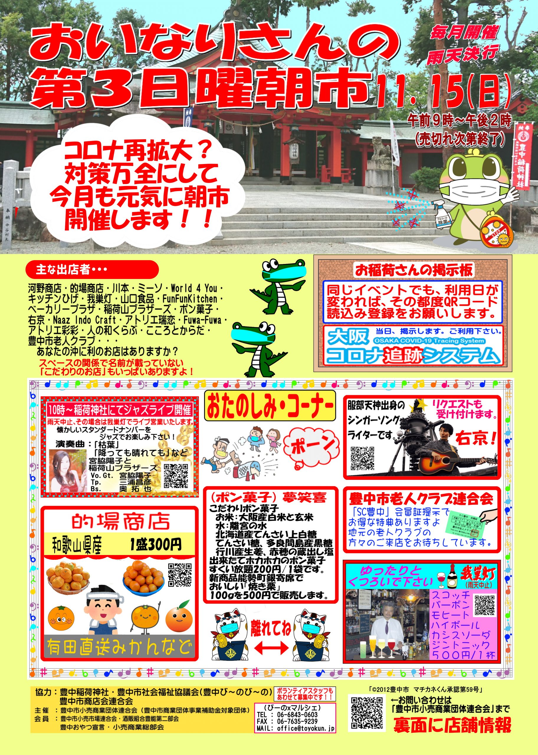 2020年11月15日(日)おいなりさんの第3日曜朝市を開催いたします すっかり秋らしくなってきましたね。1日の中での寒暖差が激しいので、体調に気を付けてお過ごしくださいね。 11月の「おいなりさんの第3日曜朝市」は15日に開催いたします。 時間は9時から14時頃までの予定ですが、状況により前後することがございますのでご了承ください。 引き続き新型コロナウィルス感染拡大防止対策をしていきますので、皆様のご協力をお願いいたします。 ぜひお立ち寄りくださいね!お待ちしております。 投稿ナビゲーション 2020年10月18日(日)おいなりさんの第3日曜朝市を開催いたします2020年11月29日(日)庄内神社・日曜朝市を開催いたします コメントを残すコメントをキャンセル