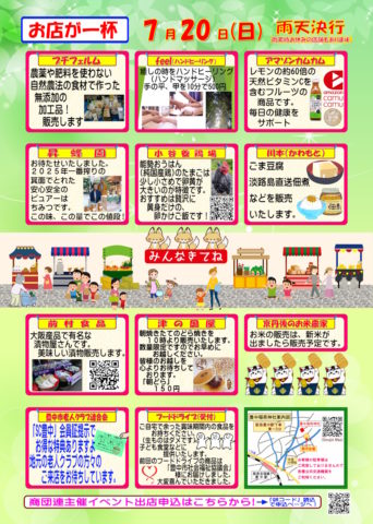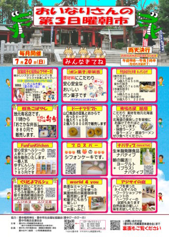 2025年7月20日(日)おいなりさんの第3日曜朝市を開催いたします 7月の「おいなりさんの第3日曜朝市」は20日に開催いたします。 9時から13時30分ごろまでの開催予定ですが、状況により前後することがございます。 また、朝市自体は雨天決行ですが、お店さんによってはお休みされる場合もございますのでご了承ください。 毎日のように猛暑日が続く今日この頃ですね。ただにわか雨も心配です。朝市当日は何とか雨が降らないで欲しいといつも願ってしまいます^^; 気温、湿度ともに高いので熱中症対策をしっかりとしてお出かけくださいね。 皆様のお越しをお待ちしておりますm(__)m 投稿ナビゲーション 2025年7月6日(日)のイベント「豊中駅前七夕まつり」『URミニマルシェ』開催します コメントを残すコメントをキャンセル