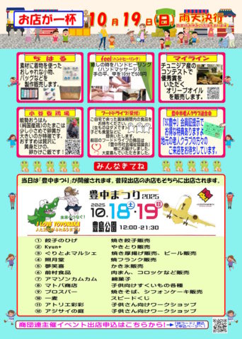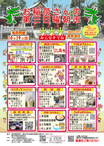 2025年10月19日(日)おいなりさんの第3日曜朝市を開催いたします 10月の「おいなりさんの第3日曜朝市」は19日に開催いたします。 今回は午後からお神輿の宮入りがあるため、9時から11時30分ごろまでの開催予定です。ただし状況により早めに終了することがございます。 また、豊中まつりに出店される会員さんが多いため規模もいつもより縮小いたします。 朝市自体は雨天決行ですが、お店さんによってはお休みされる場合もございますのでご了承ください。 やっと秋らしい気候になってきましたね。でもまだ日中は暑い日がありますので服装で調節してくださいね。 皆様のお越しをお待ちしておりますm(__)m 投稿ナビゲーション 2025年9月23日(火・祝) キッチン京むすびさん オープンされます2025年10月18日(土)、19日(日)のイベント「豊中まつり2025」 コメントを残すコメントをキャンセル