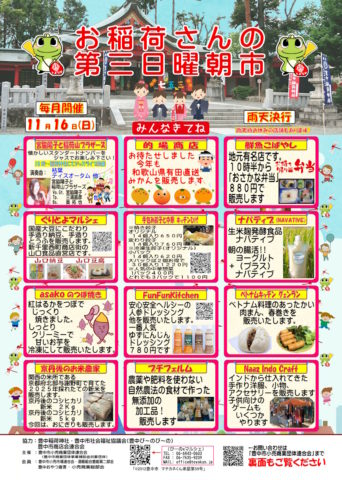 2025年11月16日(日)おいなりさんの第3日曜朝市を開催いたします 11月の「おいなりさんの第3日曜朝市」は16日(日)に開催いたします。 9時から13時30分ごろまでの開催予定ですが、状況により前後することがございます。 また、朝市自体は雨天決行ですが、お店さんによってはお休みされる場合もございますのでご了承ください。 この頃、朝晩が冷え込む日が多くなりました。急な気温差で体調を崩されないよう、服装などで調整してお過ごしくださいね。 皆様のお越しをお待ちしておりますm(__)m 投稿ナビゲーション 『にしまちマルシェ』開催です!2025年11月22日(土)のイベント「第46回豊中市農業祭」 コメントを残すコメントをキャンセル