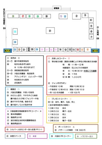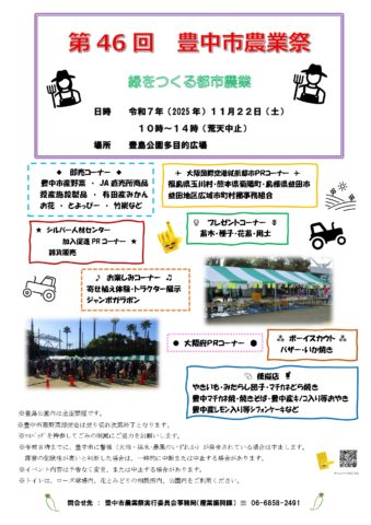 2025年11月22日(土)のイベント「第46回豊中市農業祭」 2025年11月22日(土)、豊島公園(阪急宝塚線曽根駅より南へ徒歩約5分)にて毎年恒例の「豊中市農業祭」が開催されます。 開催時間は午前10時から午後2時まで。 午前8時の時点で豊中市に警報(大雨・洪水・暴風のいずれか)が発令されている場合は中止します。 落雷の危険性が高いと判断した場合は一時的に中断、または中止する場合があります。 豊中市内の農家さんが栽培した新鮮な野菜がそろいます。毎年大人気で売り切れ次第終了となりますのでご注意ください。他にもお花やJA直売所の商品、有田産のみかんなども販売されます。 また、寄せ植え体験(材料費要 定員15名)、ジャンボガラポン抽選会(1回100円)、苗木や種苗のプレゼント、食べ物の模擬店など楽しい催しが盛りだくさんです。 お越しの際にはお買い物袋のご持参をお願いいたします。 詳細については豊中市のホームページをご覧ください。 https://www.city.toyonaka.osaka.jp/kurashi/agriculture/nougyou-sinkou/43nougyousai.html 投稿ナビゲーション 2025年11月16日(日)おいなりさんの第3日曜朝市を開催いたします千里中央公園で「第2回秋祭り」開催です コメントを残すコメントをキャンセル