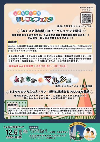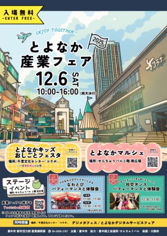 2025年12月6日(土)のイベント「とよなか産業フェア2025」 2025年12月6日(土)、豊中市内事業者の製品やサービス、技術にふれることのできる「とよなか産業フェア」が千里中央駅前で開催されます。開催時間は10時から16時までとなっております。 お仕事体験やワークショップを楽しめる「とよなかキッズおしごとフェスタ」や、地元で愛される商品を味わう「とよなかマルシェ」を開催します。 会場は、 とよなかキッズおしごとフェスタ(一部事前申し込みが必要な催しがございます): 千里文化センター「コラボ」(豊中市新千里東町1-2-2) せんちゅうパル 2階 北広場(豊中市新千里東町1-3) とよなかマルシェ: せんちゅうパル 2階 南広場(豊中市新千里東町1-3) 普段はなかなか接することのない事業者のお仕事体験や自慢の逸品にふれることで、豊中の産業や事業者の魅力を感じることができます。 また、同時開催イベントとして、デジメタフェスやとよなかデジタルサービスフェアも予定しています。 詳細は豊中市ホームページをご覧ください。 https://www.city.toyonaka.osaka.jp/machi/sangyoushinkou/eventcampaign/sangyoufea2025.html 投稿ナビゲーション 千里中央公園で「第2回秋祭り」開催です2026年1月18日(日)おいなりさんの第3日曜朝市を開催いたします コメントを残すコメントをキャンセル