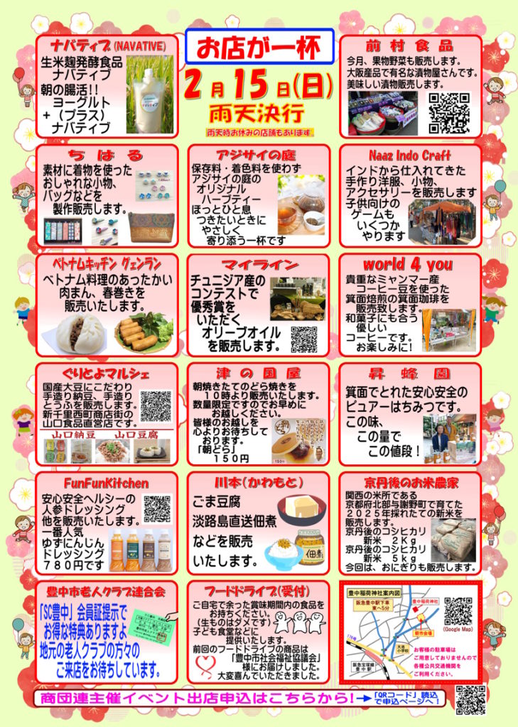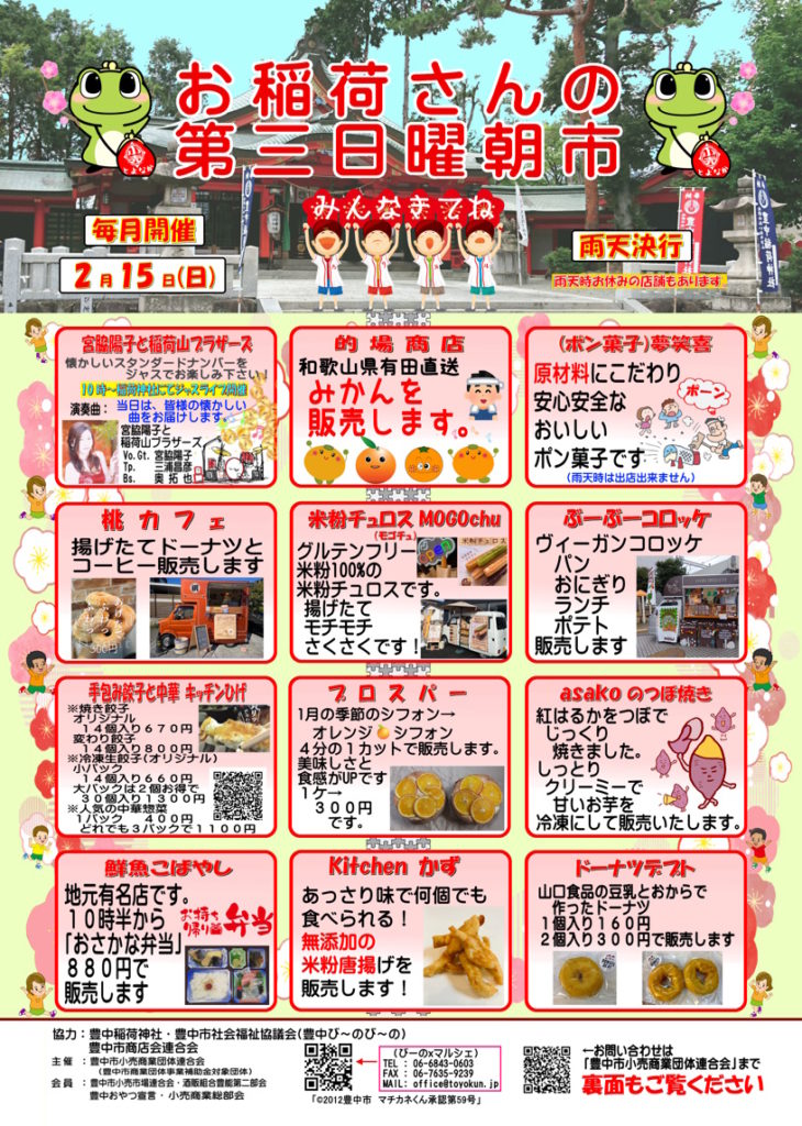 2026年 2月15日(日)おいなりさんの第3日曜朝市を開催いたします 2月の「おいなりさんの第3日曜朝市」は15日(日)に開催いたします。 9時から13時ごろまでの開催予定ですが、状況により前後することがございます。 また、朝市自体は雨天決行ですが、お店さんによってはお休みされる場合もございますのでご了承ください。 2月もまだまだ寒い日が続きそうです。少しづつ暖かくなるという予報も出ていますが、服装などで調整してお過ごしくださいね。 皆様のお越しをお待ちしておりますm(__)m 投稿ナビゲーション 令和8年 北千里マルシェ(プラス)開催します2026年3月15日(日)おいなりさんの第3日曜朝市を開催いたします コメントを残すコメントをキャンセル