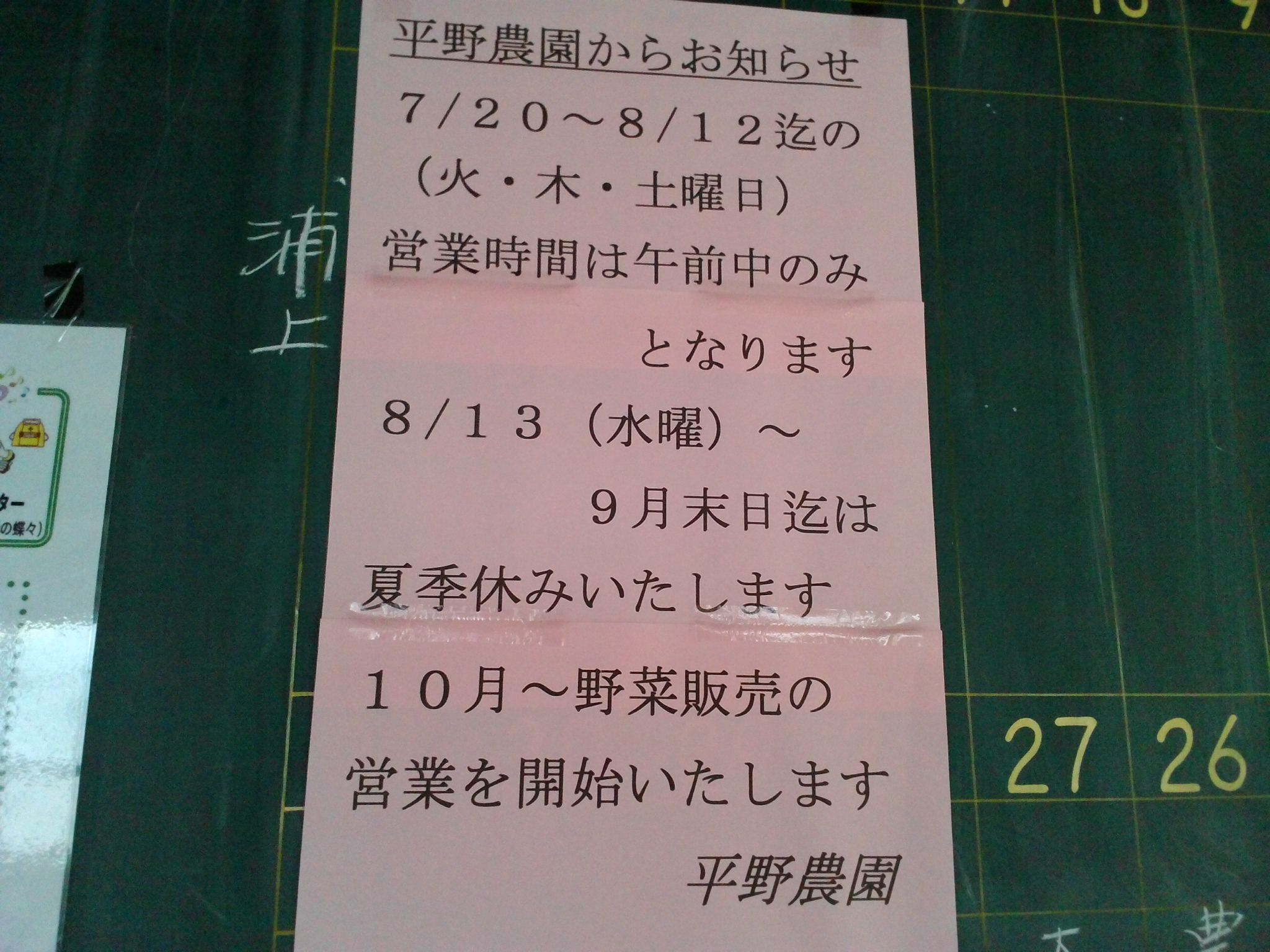 平野農園 お休み中と云うことでしたが、伺うと野菜も少しあり、お客様も来られます(^-^) 休めないんです~~と、いつものように笑われます! 今、野菜が高値でしょう、でもここでは キュウリが2本で100円でした(*^-^*) 有り難いですね。 9月の第三日曜市に、平野農園さんが来てくださいます! 事務長のでかい顔が、いや、ひろい顔が平野農園さんは とても気に入っておられ、来てくださる事となりました。 本当は、お客様の声があり、お顔の見える販売をしていただくのです(*^▽^*) 楽しみです~~ヽ(^。^)丿 投稿ナビゲーション 売れちゃった!ほっとドッグ♪ コメントを残すコメントをキャンセル