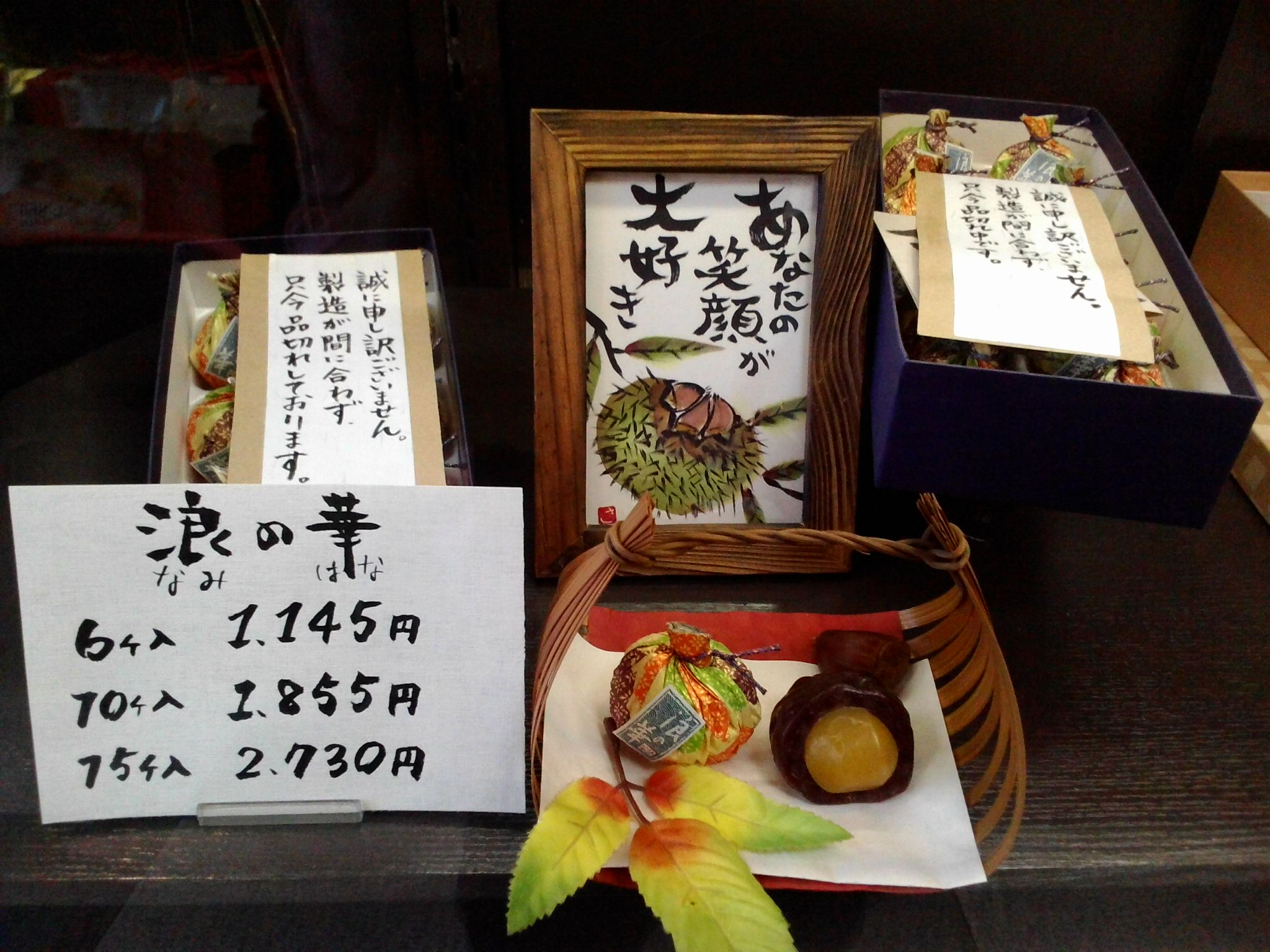 また売り切れ~~ 豊中駅前 浪花堂さん 17時頃伺いました。 あ~~(^O^) またまた、売り切れです。殆ど残っていません。 いつも浪花堂さんの、 飾り付けやPOPが素敵だな~と思うんです。 今日はお寿司やさんを ご紹介頂き、近く日曜市に、巻き寿司が登場するかもしれませんψ(‘ー’*) 投稿ナビゲーション 10月12日(日)、おかまち・まちの文化祭が開催されます!メルクカフェ コメントを残すコメントをキャンセル