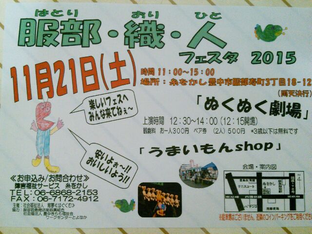 11月21日(土)、服部・織・人フェスタが開催されます! 糸をかしさんのイベント「服部・織・人フェスタ」、豊島公園での農業祭と重なっていますが、こちらも人形劇あり、飲食・物販・お遊びありの楽しいイベントですよ! 会場は糸をかしさん(豊中市服部寿町3丁目18-12 阪急服部天神駅から徒歩約15分…もう少しかかるかな) 時間は11時から15時、雨天決行です。 駐車場はございません。お近くのコインパーキングをご利用ください。 人形劇「ぬくぬく劇場」は12時15分開場、上演時間は12時30分~14時、観劇料はお一人様300円、ペア券(2人)500円 3歳以下は無料です。 演目は 12時30分~ ぽかぽか劇場「にゃんと・まぁ!?」 12時35分~ ねこじゃらし工作隊「くるみん(牛乳パック猫)」 12時45分~ ステージ発表「くるみんとにゃんと・まぁ!?」 13時05分~ 豊中エイサー豊優会「唐船ドーイ~カチャーシー~」 13時15分~ 人形劇団せっぽく座「たべられたやまんば」 13時35分~ 人形芝居ぬくぬく座「ひょっとして、桃太郎!?」 の予定です! 「うまいもんSHOP」では、豆乳ドーナツ、おこわ、あべかわもち、練り天、能勢の野菜、綿菓子、クッキー、ポップコーン、ジュース、刺身こんにゃく、屋台ラーメンなどの食べ物の販売や創作品やキャラクターすくいなどのお店が並ぶ予定です。 中でも普段は車を止めてもらわないと食べられない夜鳴きラーメンが、車を止めてお客様を待って下さるらしいのです^^; すごく気になりますよね! 三連休の初日ですが、お近くの方、通りすがりの方も是非お立ち寄り下さいね(^_^)/ お問い合わせは、糸をかしさん(電話:06ー6868ー2153)まで。 投稿ナビゲーション こんぶもち11月21日(土)、服部・織・人フェスタ2015のチラシです! コメントを残すコメントをキャンセル