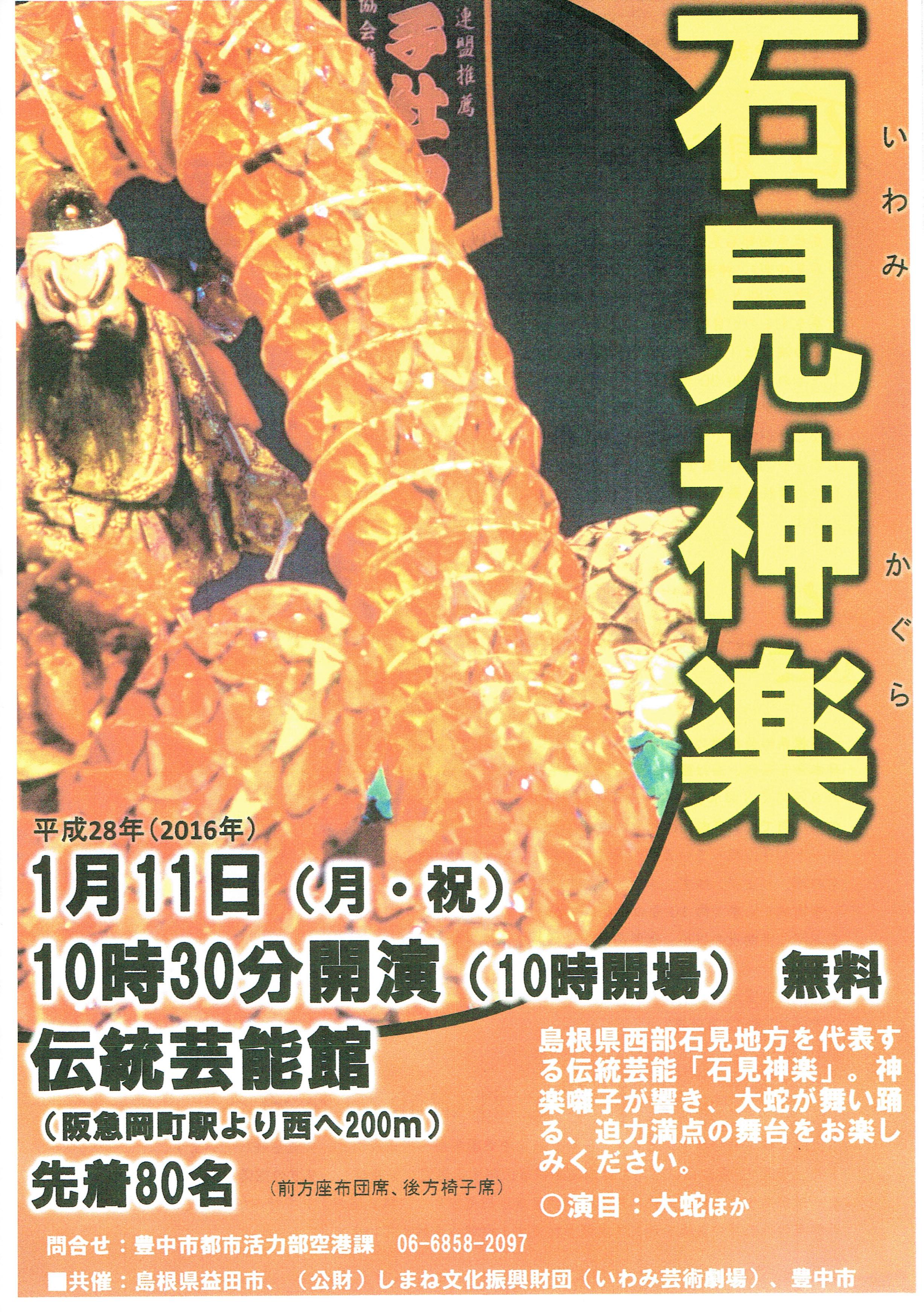 2016年1月11日(月・祝)、伝統芸能館で石見神楽を上演します 益田市と豊中市は大阪国際空港で結ぶ就航都市のひとつとして、平成25年7月から友好都市協定を提携しています。実は私、大阪国際空港の就航都市ということは知っていましたが、友好都市になったことは初めて知りました。 豊中市ホームページによると、このイベントは両都市の文化交流事業として実施するそうです。 1月11日(月曜・祝日)、豊中市立伝統芸能館(阪急宝塚線「岡町」駅西へ約200メートル) 時間:午前10時半から正午まで(開場は午前10時) 豊中ではなかなか見る機会の少ない石見神楽、興味のある方はこの機会にぜひ。 豊中市のホームページはこちら。 www.city.toyonaka.osaka.jp/machi/kukou/kukou_topics/event0111.html 投稿ナビゲーション 12月22日(火)、23日(水・祝)、24日(木)おかまちレールロードの様子です!映画と文化を考える集い~山田洋次監督最新作「家族はつらいよ」の先行上映会とトーク~ コメントを残すコメントをキャンセル