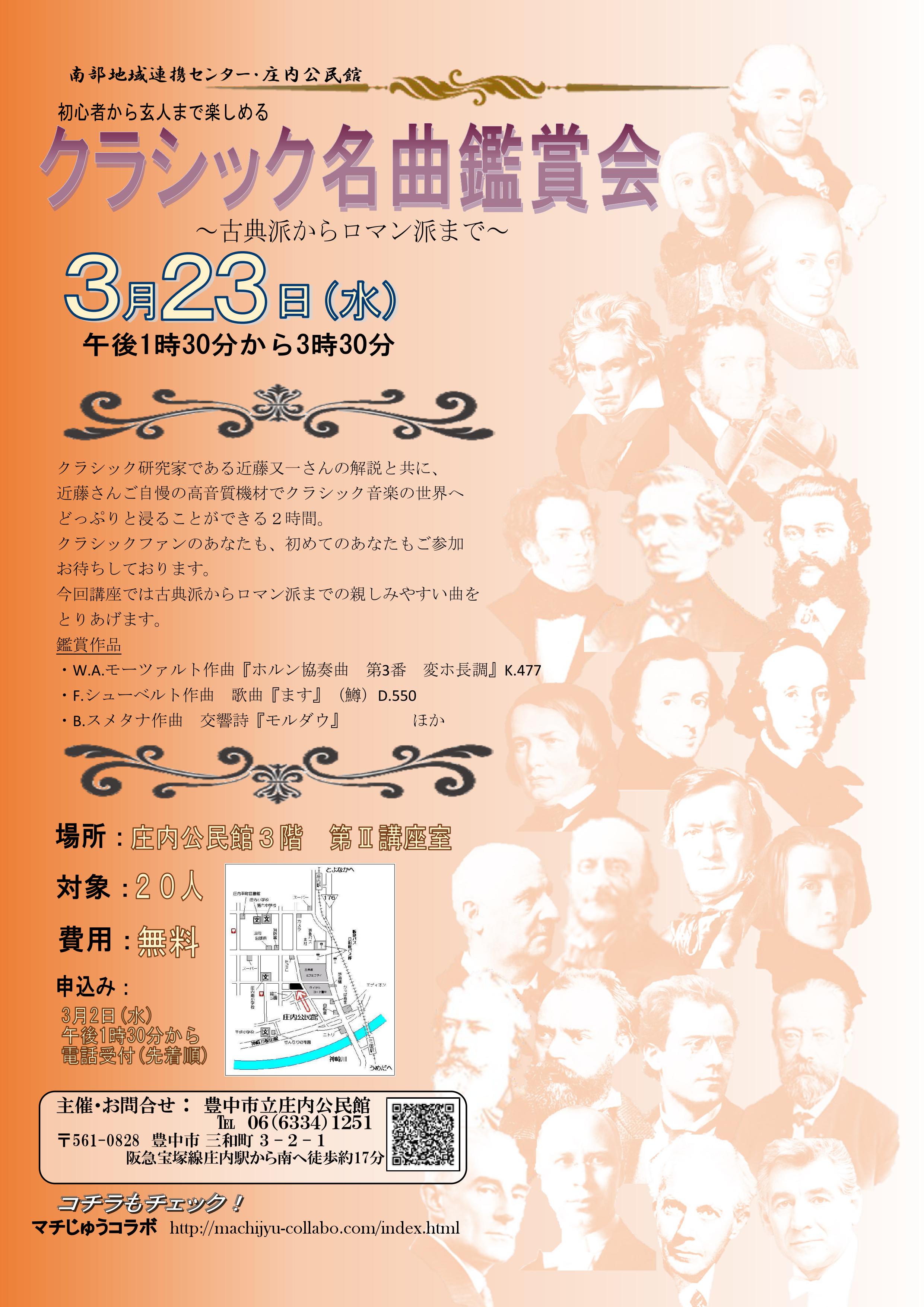 クラシック名曲鑑賞会@庄内公民館 平成28年3月23日(水曜)午後1時30分から3時30分、庄内公民館3階 第2講座室にてクラシック研究家 近藤又一先生によるクラシック鑑賞会を開催いたします。 近藤先生はクラシック音楽研究家で、毎月第3日曜日には桜塚ショッピングセンター2階「あーとらんど」でCD鑑賞会を開催されていらっしゃいます。 そして「おかまちレールロード」にも色々と協力していただだいています。 今回は岡町を飛び出して、庄内でクラシック音楽の鑑賞会を開催されるということです。 参加申し込みは電話予約で先着20人ということですので、参加ご希望の方はお問い合わせくださいね。 詳しくはこちら。 www.city.toyonaka.osaka.jp/shisetsu/koumin_library/shounai/kouza/20160303113041367.html 投稿ナビゲーション 新しい中華のお店ジャージャー麺セット コメントを残すコメントをキャンセル