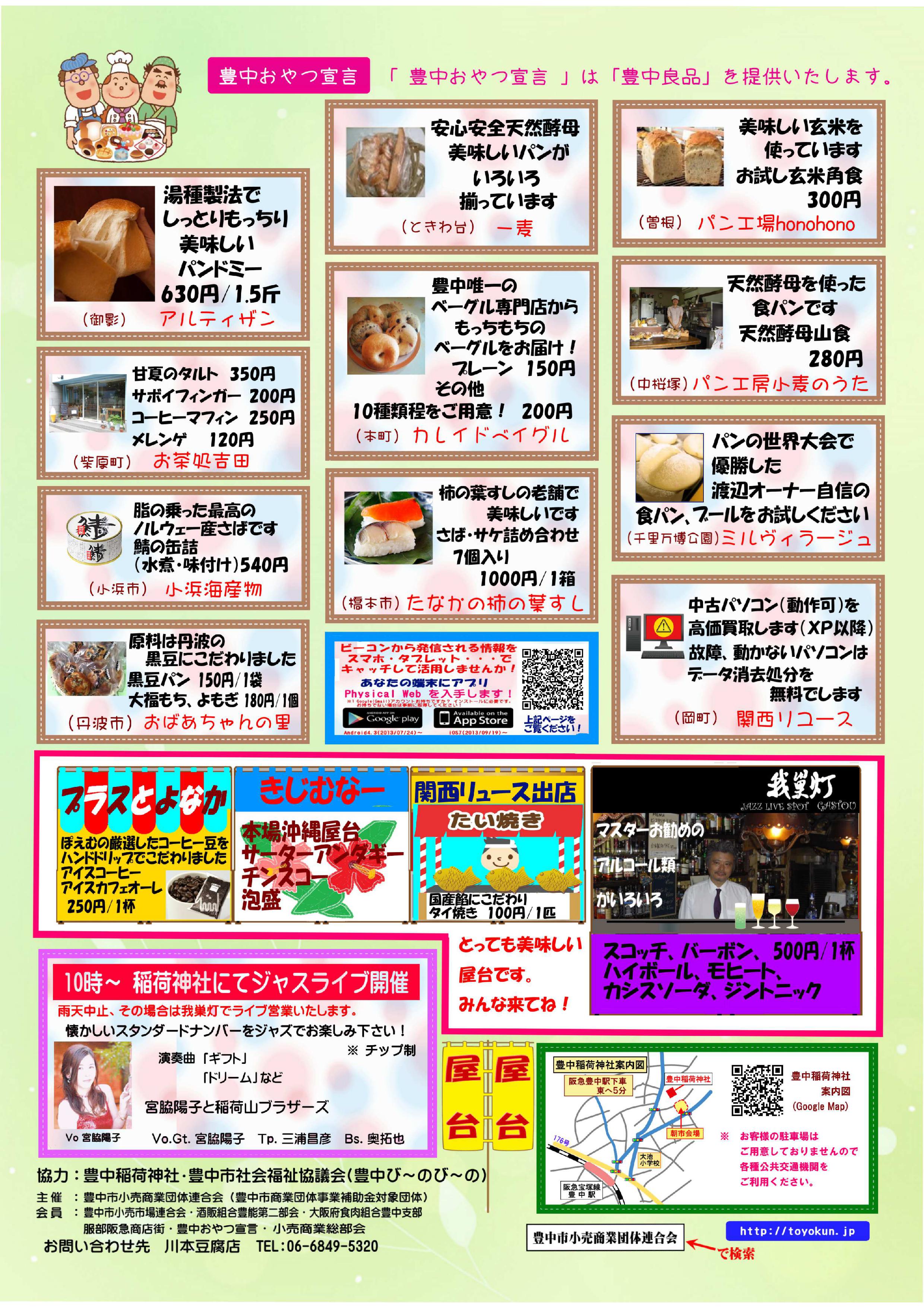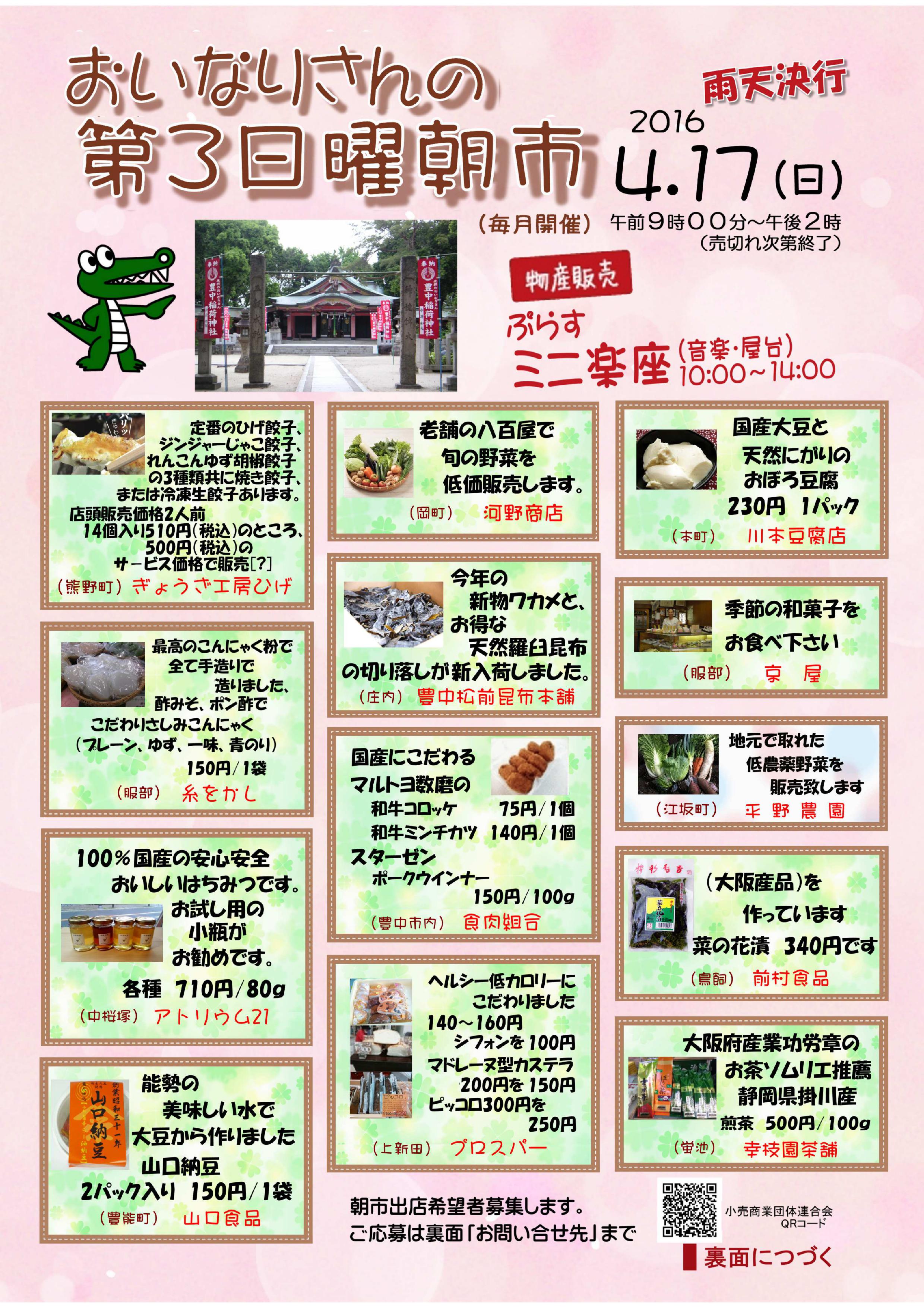 2016年4月17日(日)「おいなりさんの第3日曜朝市」を開催いたします 春らしいあたたかい気候で、お出かけにはぴったりな時期になりましたね。 来週17日は、豊中稲荷神社(阪急豊中駅東へ約5分)にて「おいなりさんの第3日曜朝市」を開催します! 今月は本当に久しぶりに平野農園さんが出店予定です。地元で採れた低農薬野菜はいつも大好評なんだそうですよ。ぜひお見逃しなく! 丹波市「おばあちゃんの里」からは、黒豆パンと大福餅が届きます。こちらも久しぶりの登場ですね。 食肉組合さんは、お買い得で美味しいポークウインナーを新発売! お肉屋さんおすすめのポークウインナー、一度ぜひお試しください。 恒例のジャズライブに、朝から飲めるアルコールの屋台など盛りだくさんです。 皆さまお誘いあわせの上、お立ち寄りくださいね! お待ちしております(^0^)/ 投稿ナビゲーション 出張運転会@桜塚公園桜まつり2016「un,deux(アン、ドゥ)」さんのカレーランチ コメントを残すコメントをキャンセル